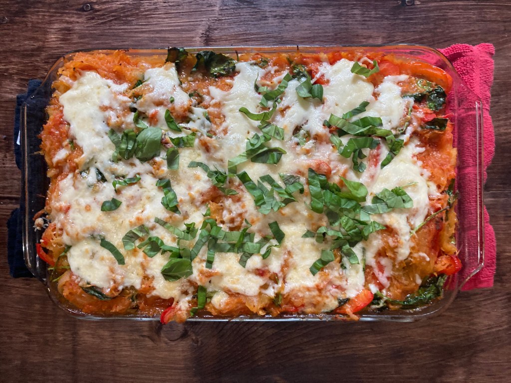 - Get a large glass casserole (9×13) dish out and spoon the squash mixture into it. Top it with an even layer of mozzarella cheese. Add it to the oven for 30 minutes. Once the thirty minutes is over, it should be bubbling a bit on the edges. Turn it on broil high and watch it closely to get a nice browning on the cheese. Do not step away for this step as it is easy to burn. Chiffonade the basil and add it on top. Serve after allowing to cool a bit as it is quite hot. Enjoy!