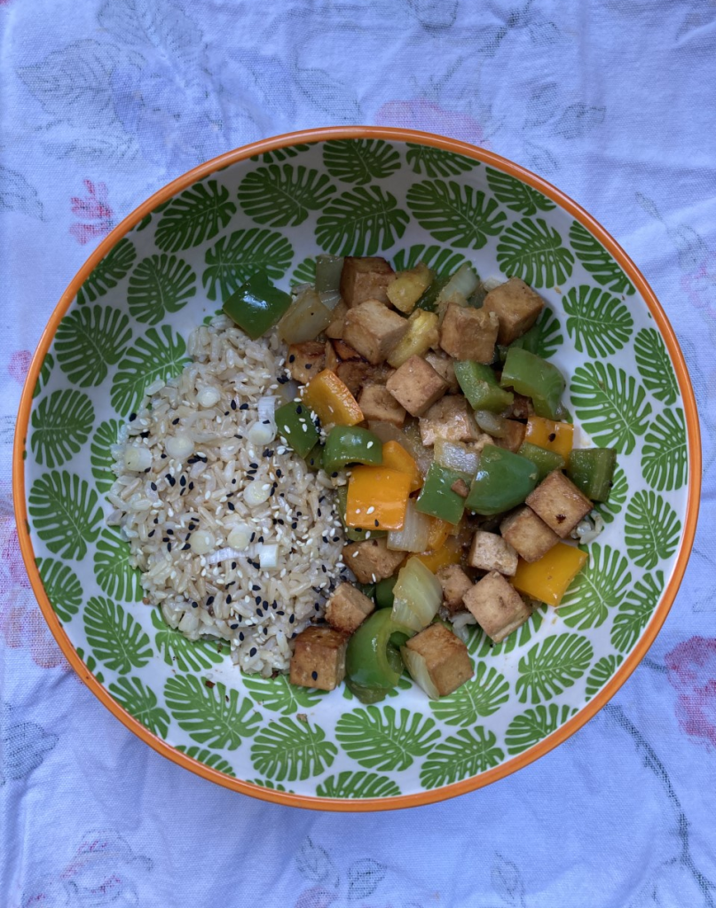 This is a delicious tofu stir fry that is a bit different than the typical soy sauce based stir fry. There is a vibrant citrus sauce with lots of ginger (and just a splash of soy sauce). Tying the dish together are small bits of pineapple in the stir fry that give you a delicious sweet explosion in your mouth. The bell peppers and the onion are only cooked lightly, giving the dish a nice texture.