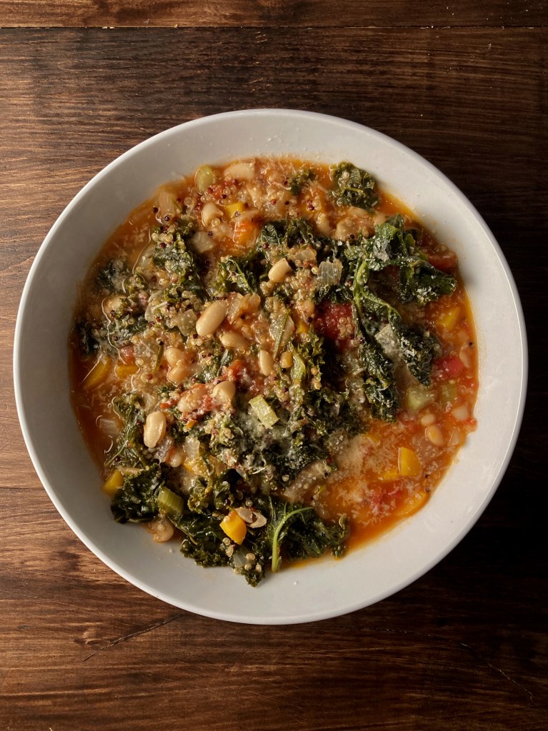 - With the kale integrated into the soup, add the cup of quinoa and bring it to a boil on medium high heat. Once bubbling, turn it down and let it simmer for 12-15 minutes without the lid. It is finished once the quinoa has been cooked. Aim for slightly “al dente” quinoa as it will continue to cook even after removed from the heat. Remove from the heat. Taste for salt and pepper, adjust accordingly. Serve topped with a sprinkle of parmesan.