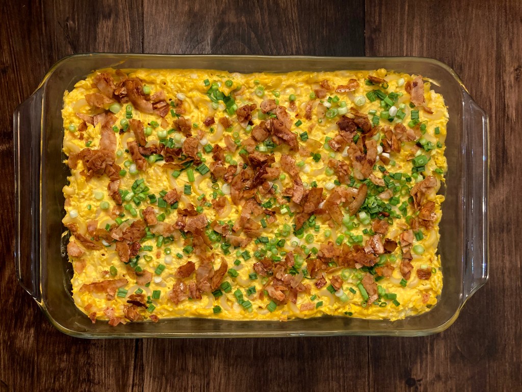 - Now it is time to assemble, get a 9x13in casserole dish. Add the pasta, cauliflower, sauce and the shredded cheese. Mix well. Top with the coconut bacon and the green onion. Place in the oven for 15 minutes, until it is bubbling around the sides. Enjoy!