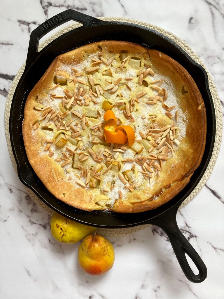 This recipe is about as close as you can get to having a wonderful brunch without doing much of the effort. This is a spin-off of pannekoeken, an eggy dutch pancake. It often incorporates apples and sometimes even bacon. Mia introduced me to pannenkoeken, and we have since begun experimenting with different fruits. We have made the classic with apples, we have tried with wild blueberries and, as you can tell from this recipe, we have made it with pears.