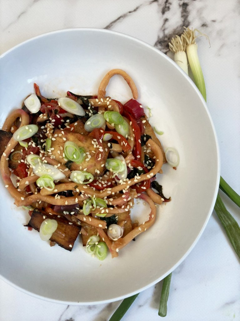 The inspiring factor behind this dish was trying to experiment a bit more with different methods of cooking tofu. I wanted to try and dry out the tofu to make it chewier and see what it would add to a noodle dish. To achieve this, the tofu is baked on a wire rack, allowing it to dry out without burning. I was pleasantly surprised with how it turned out: when it is mixed in with the sauce it is chewy, but not dry. To go along with the tofu is a bright mix of chard, bell peppers and shimeji mushroom on top of fresh udon noodles. I hope you enjoy!
