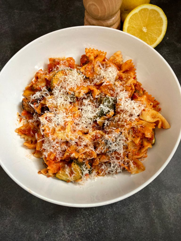 This recipe was inspired by an Ottolenghi recipe that we made recently. We made Ottolenghi’s version of Puttanesca, a pasta dish with tomatoes, olives and capers. This recipe was special because he cooks the pasta in the sauce while it simmers. At the end of his recipe he says that once you try simmering pasta in sauce “you may not feel the need to boil pasta ever again”. Well, he was not wrong– the pasta was delicious and full of flavour. Since then, I have been trying out this method with great results. In this recipe we make a simple sauce and add some mascarpone at the end to give it a nice creamy taste. We add in roasted vegetables and then finish it off with a fresh squeeze of lemon juice for acidity. I hope you enjoy!