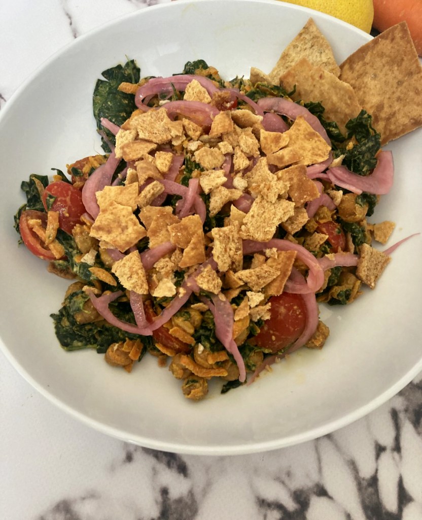 - Top salad with pickled red onions and crushed pita chips. Enjoy right away! Can be stored until the next day in the refrigerator as well.