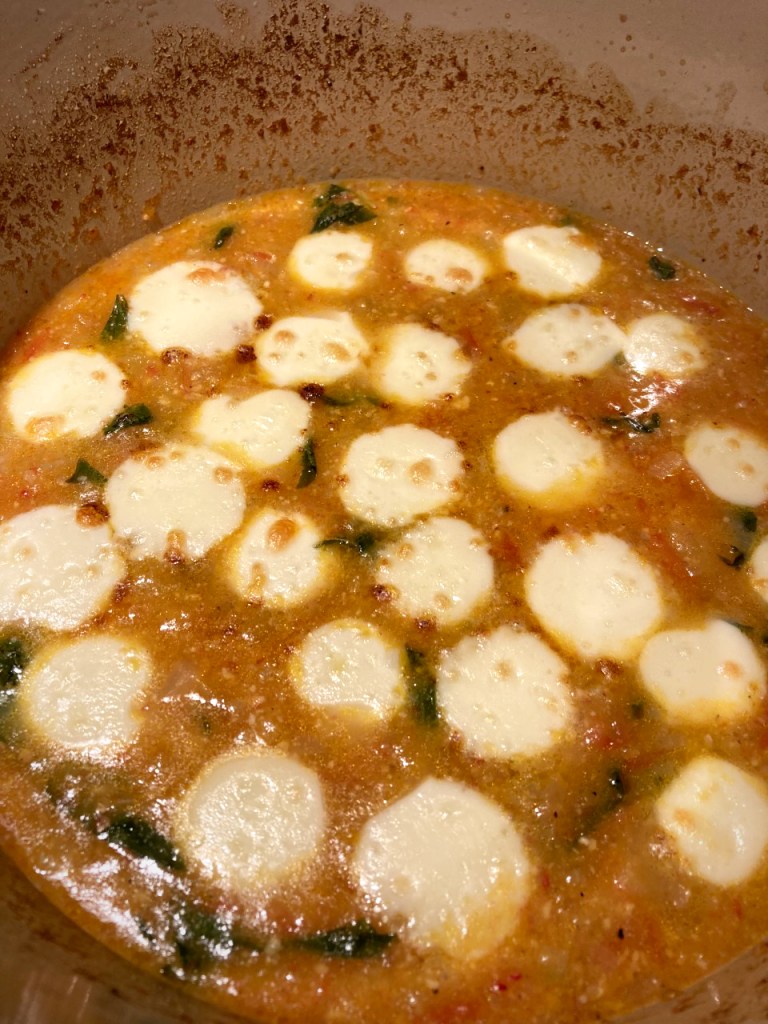- Gently place the bocconcini into the sauce, trying not to let them get submerged in the liquid. Gently place the sauce into the oven so as to not disturb the bocconcini you so carefully placed. Broil for a few minutes until the cheese begins to bubble and brown. Remove from the oven, cover and set aside.