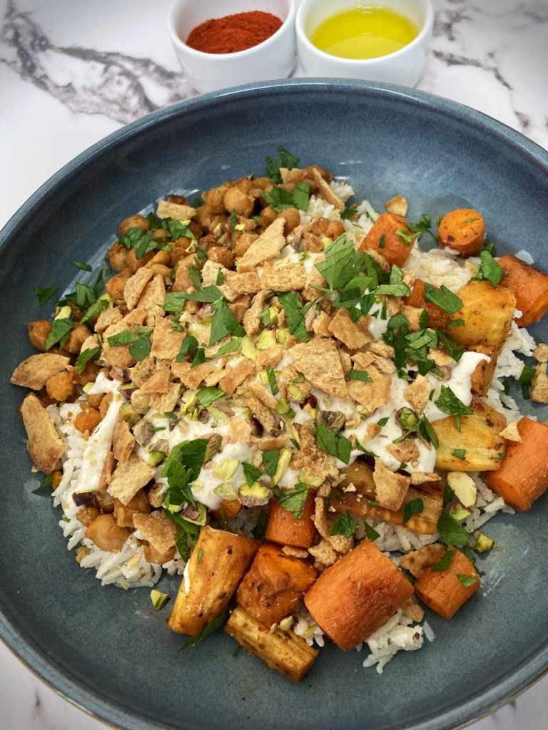 All this is to say that this recipe is based on a dish we tried at Damas a few months ago called Fattet Mozat — described on their menu as: Alberta lamb shoulder, rice, tahini yogurt sauce, crispy pita, nuts, ghee. It was so delicious, I decided I wanted to try and recreate the dish at home while obviously omitting the lamb shoulder. While it is clearly not as indulgent as the original dish, I think it’s pretty damn good and captures the same flavour profile as the original dish. I hope you enjoy this dish, and if you ever come to Montréal be sure to check out Damas, their vegetarian fare is also amazing!