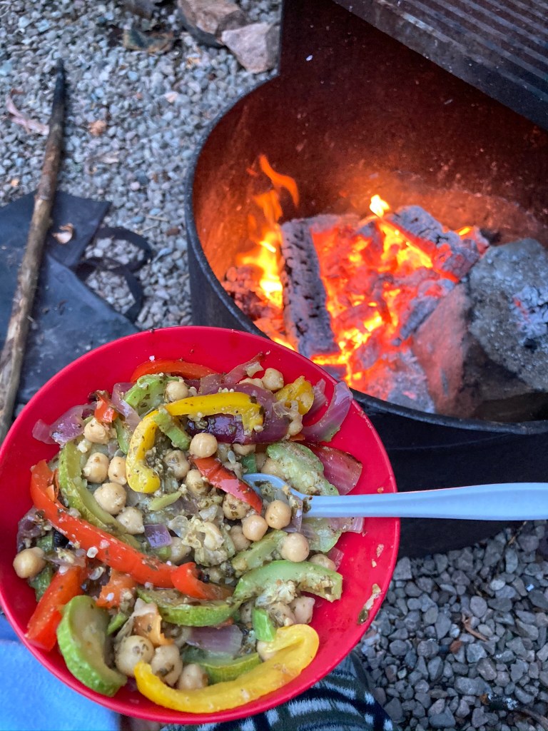 Today’s recipe has been a staple in our apartment for a while, and we actually started making it for the first time while on vacation! Two summers ago now, in September 2020, we went on the only vacation we essentially could at the time, camping! We were researching camping friendly vegetarian meals and stumbled upon an easy enough looking recipe for a one pot quinoa and bean skillet. We prepped all the ingredients, and made it on the fire the night before my birthday. It came out delicious (as pictured below) and we have been making it ever since!