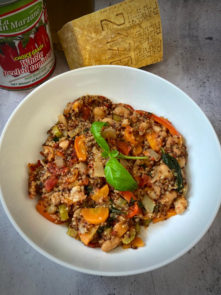 - Add in the tomatoes, quinoa, broth, beans, italian seasoning, chili flakes and 1 tsp of salt and bring to a boil on medium high heat. Once it begins to bubble turn the heat down to low and simmer for 14-17 minutes with the lid ajar until the quinoa is cooked al-dente.