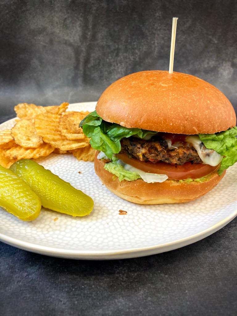 The beauty of veggie burgers is that you can give them a ton of different flavor profiles, mushroom, sweet potato or bean based burgers all have their distinct qualities. This burger is bean based and tries to stick to the tex-mex flavor profile with a couple of twists. First off, we add in some dried porcini mushrooms to add an umami flavor without overwhelming other elements. Additionally, corn brings a sweet twist to the burger complementing the other spicy & smoky flavors. Enjoy as a burger, mashed up in a wrap or crumbled on top of a salad!