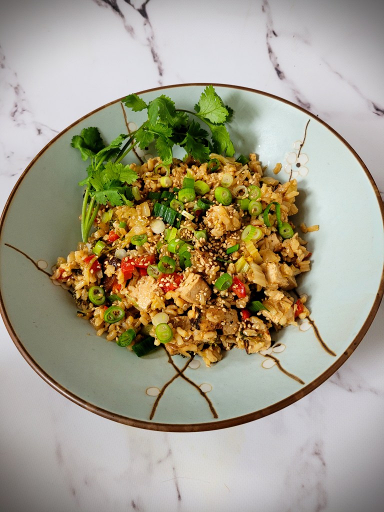 - Once the tofu is cooked to your liking, add the vegetables back into the same pan. Pour the sauce over and combine over medium low heat. Add the rice and the cilantro in as well, and stir to combine. Taste for salt levels and adjust accordingly. Serve in large bowls with thinly sliced green onions and sesame seeds to top. Enjoy!