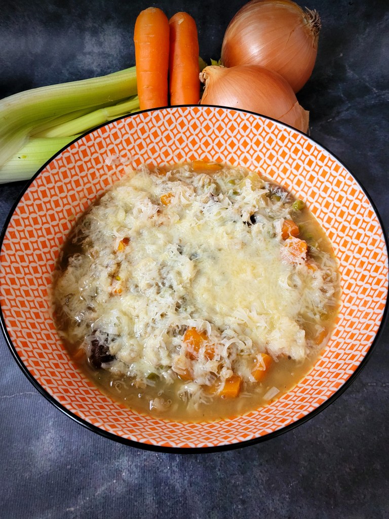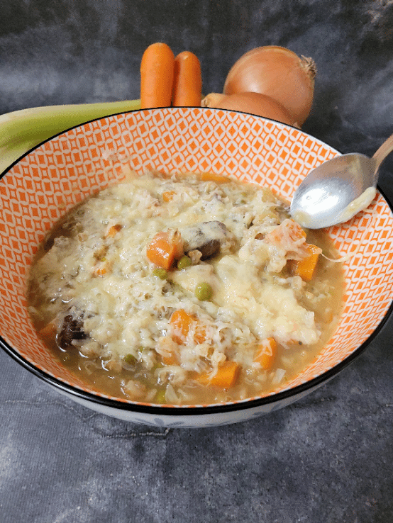 While the onions are certainly the star of the show, the supporting part is played by one of my favorite ingredients: dried shiitake mushrooms. I know these are a frequent ingredient on my blog. They are packed with flavor, cheap and also the water used to rehydrate them makes a pungent mushroom borth, which of course we will use in our soup. Instead of bread, I opt for hearty pot barley. A delicious chewy grain which will keep its structure when cooked in the soup. Of course, as any good french onion soup, we top the soup off with a generous layer of gruyère cheese for some ooey-gooey goodness with each bite. I hope this soup finds a way into your kitchen, and the hearts of those who surround you soon.
