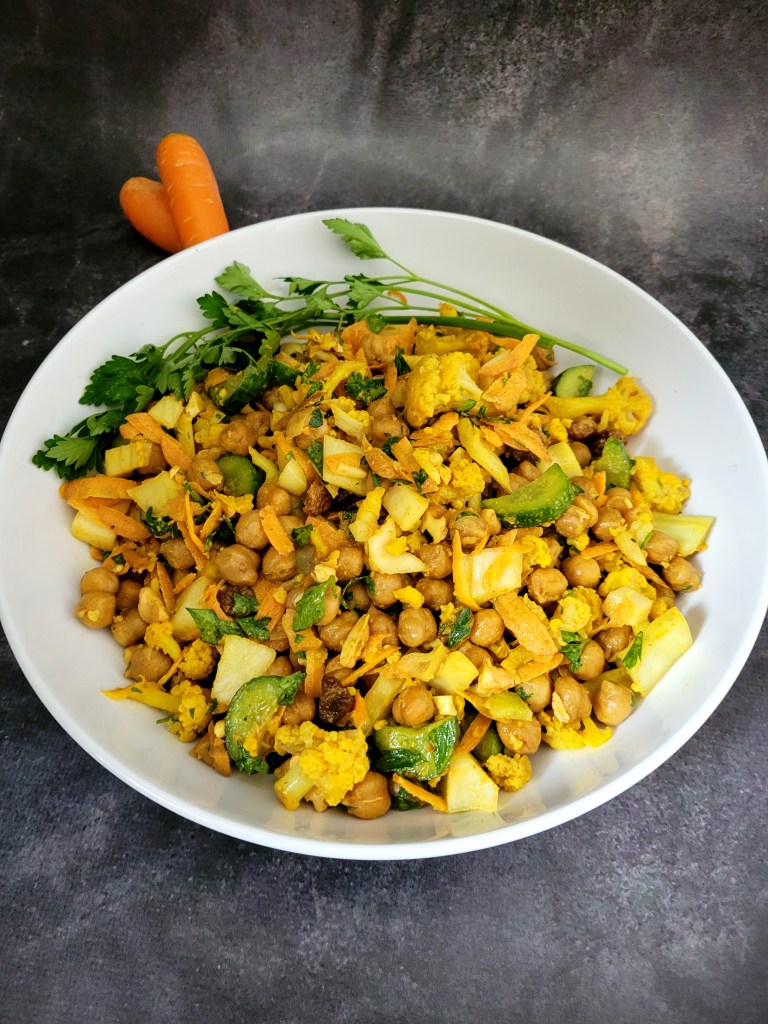 - In a large bowl, combine the grated carrots, cucumbers, walnuts and raisins. Once the cauliflower and chickpeas are done and slightly cooled add those as well. Add in the sauce and toss. Add fresh parsley to taste. Check for salt levels at this point and adjust accordingly. Serve & enjoy at room temperature!