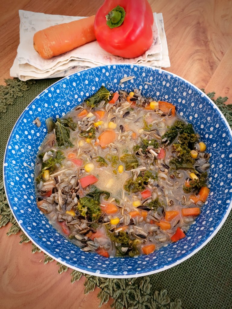 - While soup is cooking, prepare the kale. Wash it and remove it from the ribs. Break it into small, bite sized pieces. Once the wild rice is cooked through, slowly work in the kale until it is all integrated and wilted.