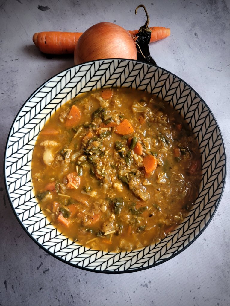 - Add the carrots, cauliflower, collard greens, lentils, coconut shreds, nutritional yeast, omani lime, and vegetable broth. Add enough additional water to cover all the ingredients. Bring to a boil, then simmer on medium-low heat for 45 minutes with the lid slightly ajar, stirring occasionally.