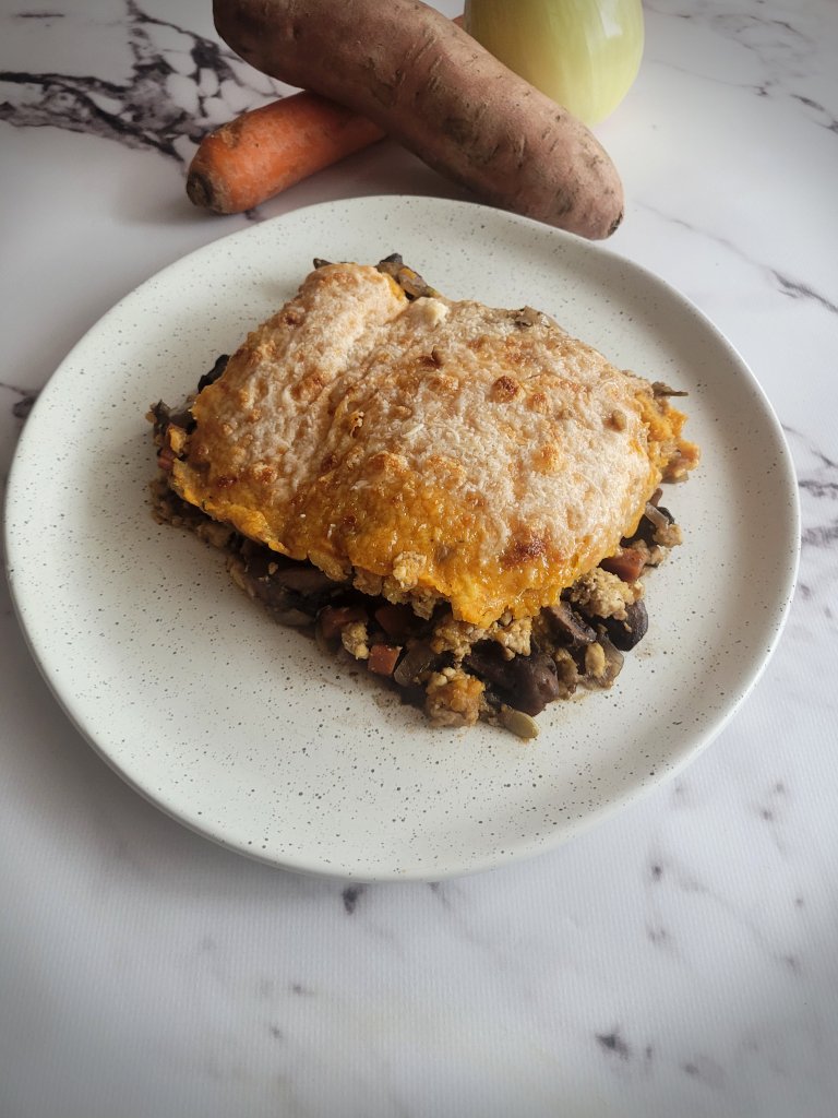 The creative process is different for everyone. Sometimes it feels like I’m longing for ideas; other times, the ideas just slap me out of nowhere. This recipe inspiration falls squarely in the latter category, coming to me mid-conversation while sitting in the car with a friend. I inadvertently blurted out my recipe idea, interrupting our conversation and furiously typing it out in my notes app. The idea that struck: a sweet potato casserole with tons of umami flavor, produced by a savory mushroom layer at the bottom.